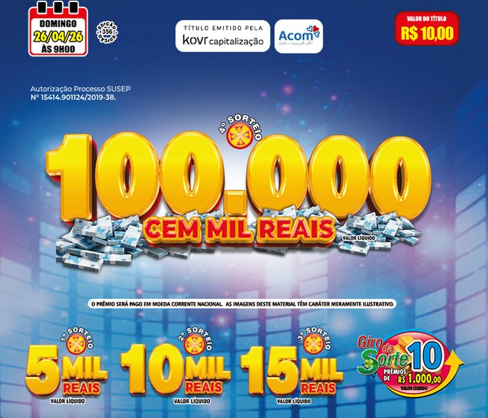 Sorteios decorrentes de Títulos de Capitalização de Pagamento Único, da Modalidade Filantropia Premiável, emitidos pela INVEST Capitalização S/A., inscrita no CNPJ sob nº 93.202.448/0001-79 e aprovados pela SUSEP. Você pode ajudar a ASSOCIAÇÃO DO COMBATE AO CÂNCER DO CENTRO-OESTE DE MINAS -ACOM comprando o Centro Oeste Cap e cedendo o direito de resgate. A aprovação deste Título pela SUSEP não implica, por parte da Autarquia, em incentivo ou recomendação a sua aquisição, representando exclusivamente, sua adequação às normas em vigor. Antes de contratar, consulte previamente as Condições Gerais.